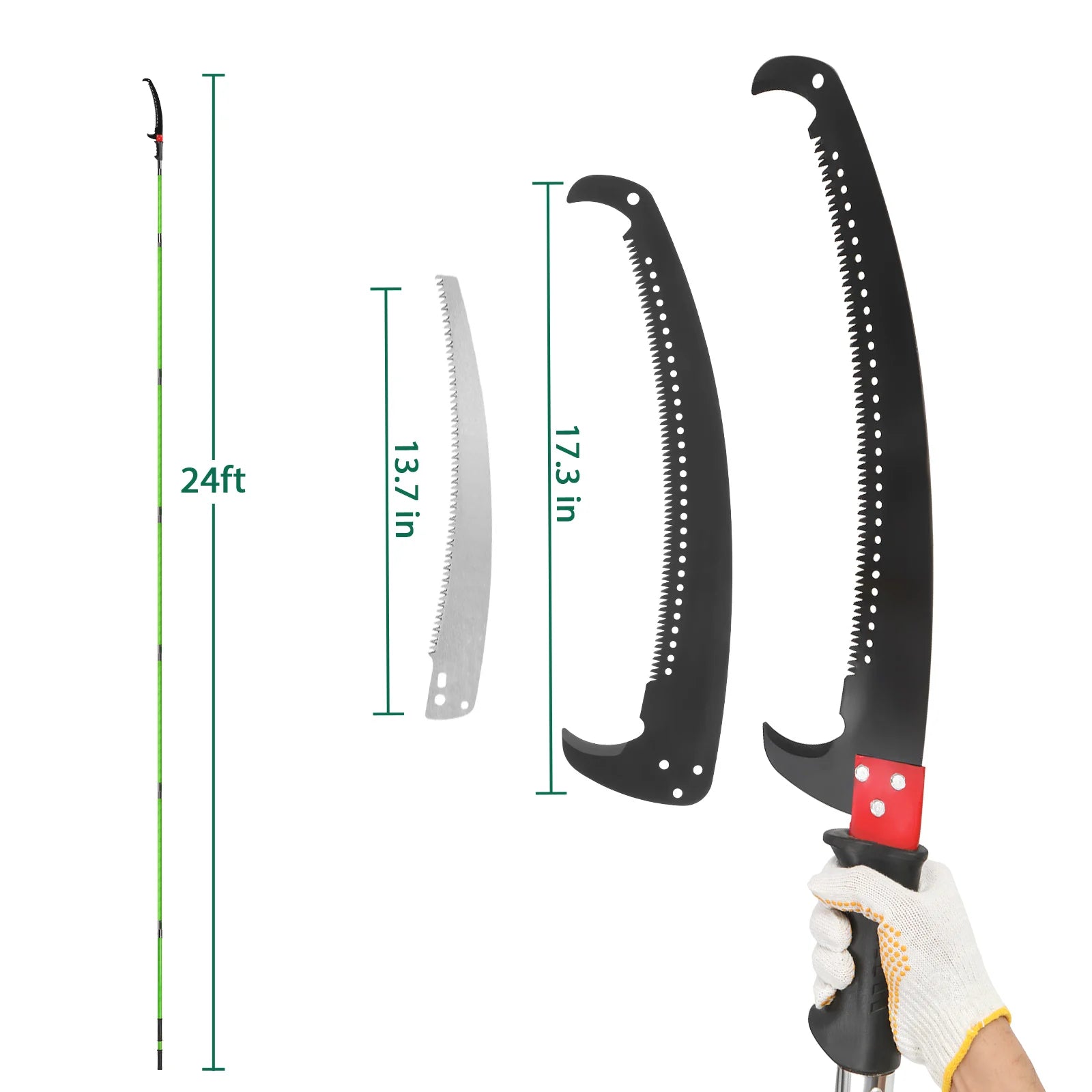 Discover the ease and convenience of maintaining your garden with our 24ft Manual Pole Saw Set, an all-in-one set designed to tackle high branches and shrubbery with ease. Crafted from durable alloy steel and lightweight fiberglass, this pole saw combines sharpness, durability, and ease of use into one versatile tool. Perfect for pruning tall trees and ground shrubs without the need for a ladder, our pole saw set ensures safety and efficiency in your garden work.