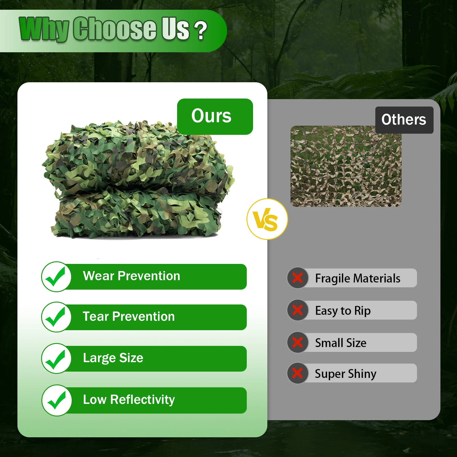 It is great for camping, hunting, party decoration, wild photography, military activities, wildlife watching, CS games, covering the car and farmland, shading factories, and greening mountains, etc. It is also used as a decoration for filming movies, programs, and other occasions.