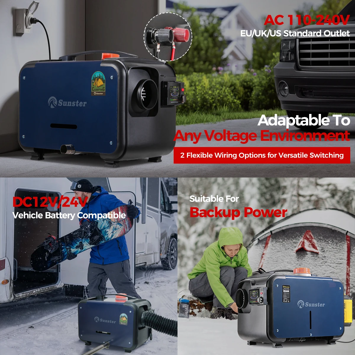 Universal Dual Power Input (12V/24V DC & 110V-240V AC): Sunster diesel heater compact automatically switches between vehicle and household power, allowing you to use it both on the road or at home. Perfect for those looking for versatile heating solutions across various settings.