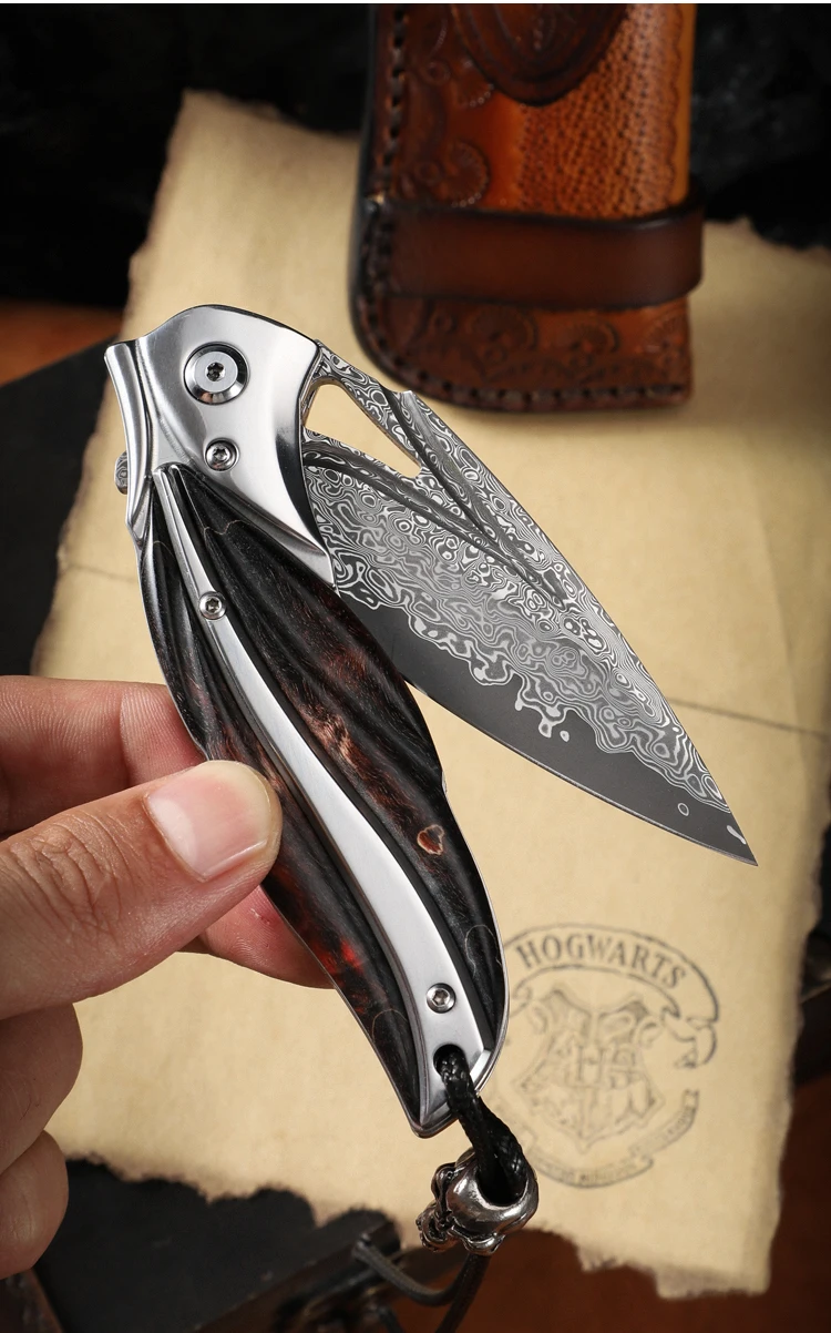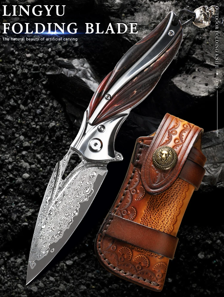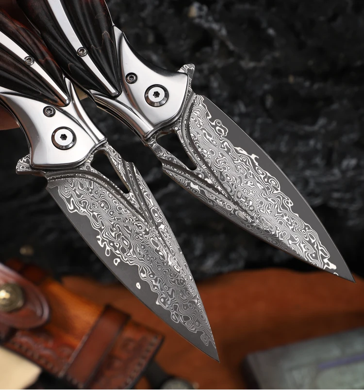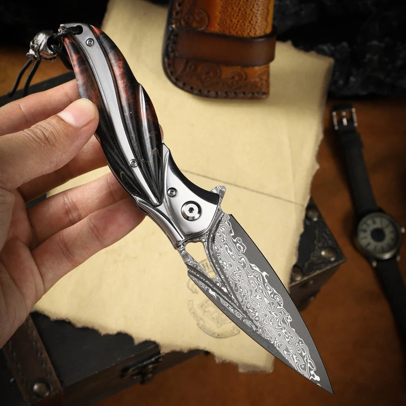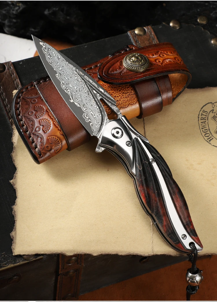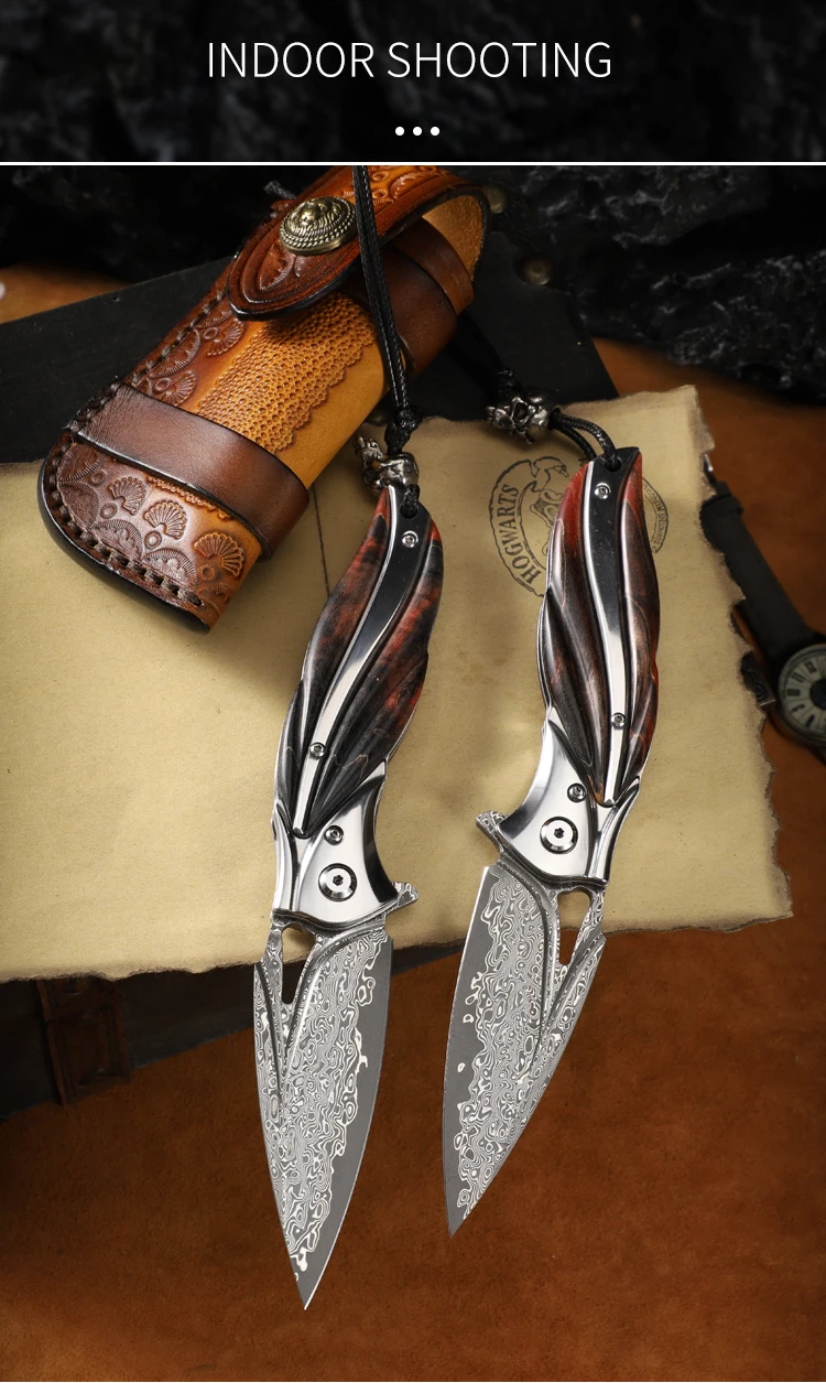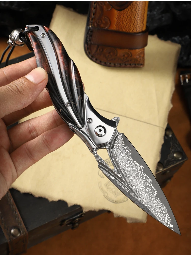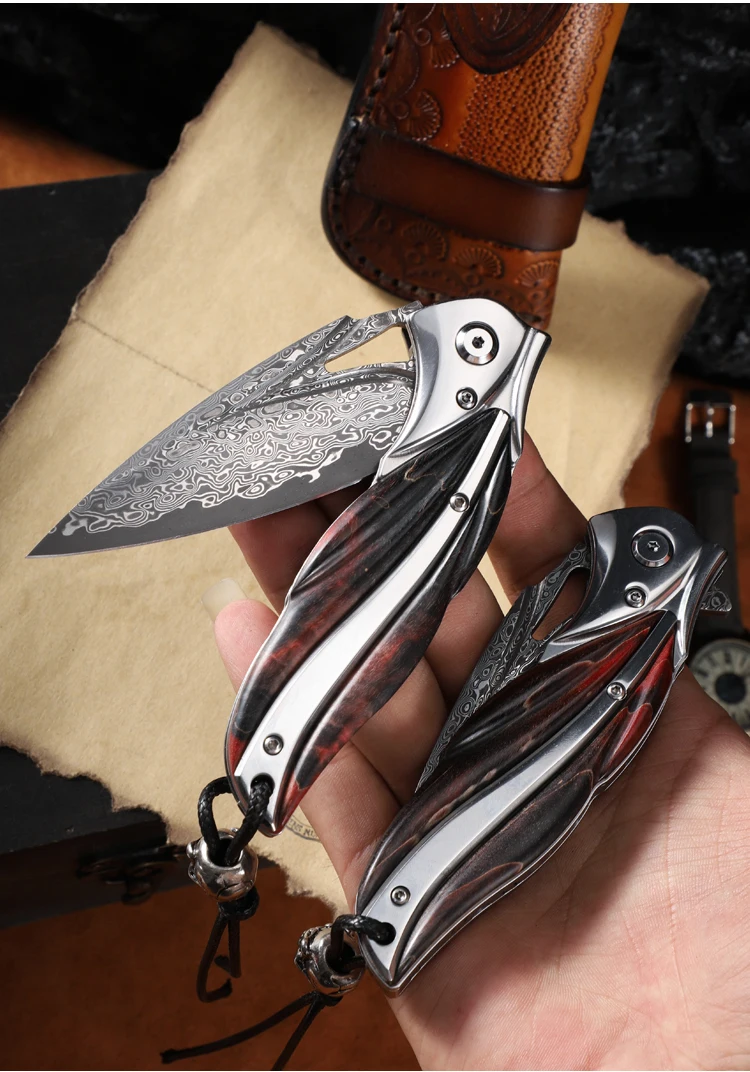 Canivete de aço de Damasco de alta qualidade, canivete EDC para homem, caça ao ar livre, canivete dobrável para campismo