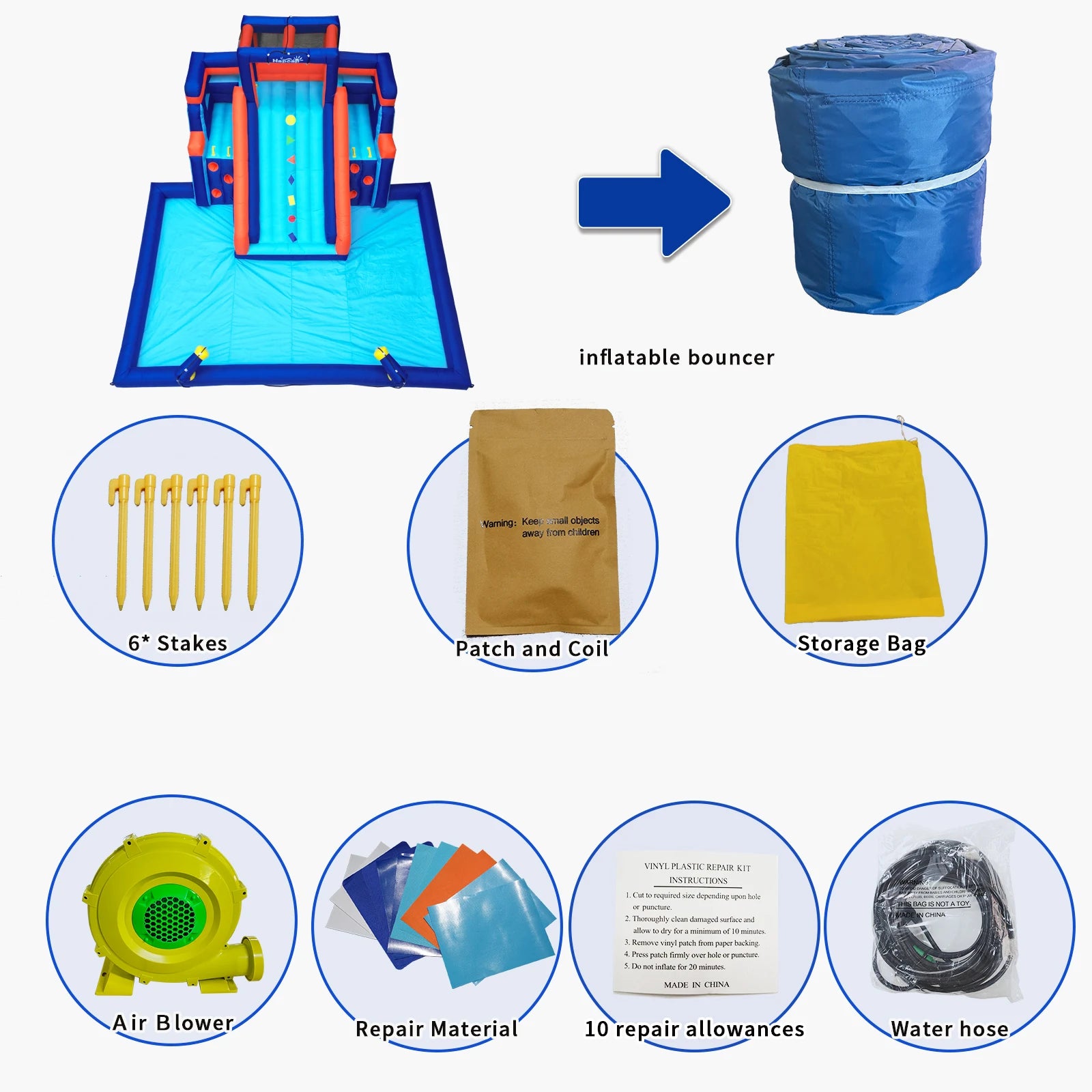 【Easy to Setup and Storage】With quick and straightforward assembly procedures, our water slide can be set up within minutes and easily stored after use. Simply unroll the bouncy house, connect the blower, stake it down securely, and turn on the blower. When not in use, it can be deflated quickly for compact storage in the included carrying bags