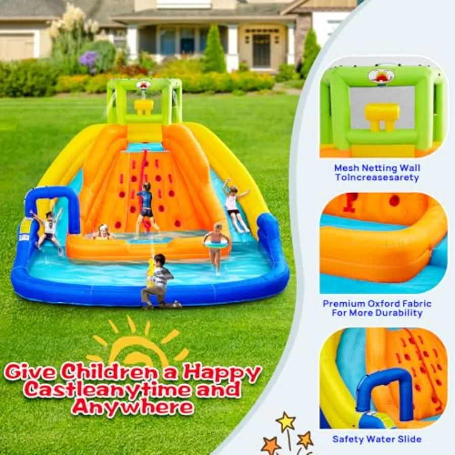 Inflatable Water Slide Bounce House with Water Bucket Deep Pool Climbing Wall with Rope Bouncy Castle with Air Blower