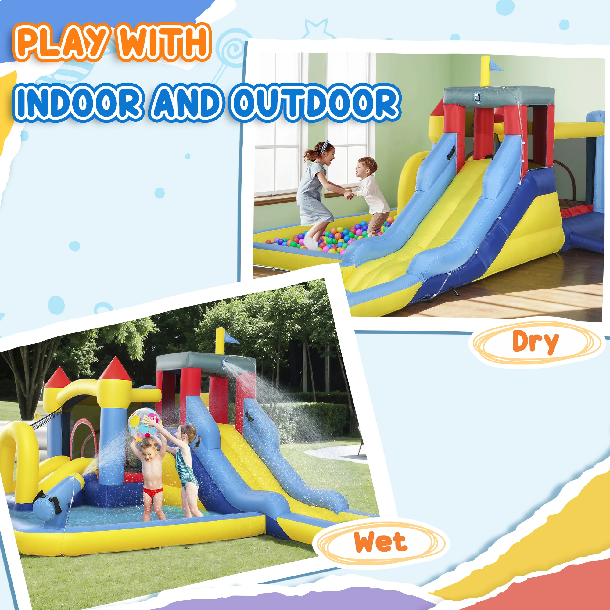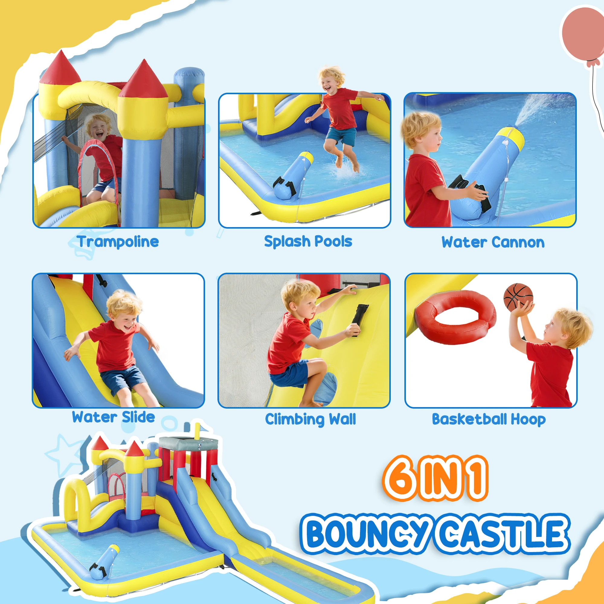 Dive into fun with the qaba water slide for kids' backyard!This six-in-one water bounce house features dual slides, pools, a climbing wall, a trampoline, a water cannon, and a basketball hoop for endless outdoor excitement.Güvenli bir şekilde korunan örgü duvar ve kaydırak korkulukları sayesinde, çocuklar serinleyip oynamak için harika bir yer.Dönüldüğünde, daha serin havalarda da yıl boyunca eğlenceyi yaşayabileceğiniz bir top havuzu haline gelir.Equipped with a 550w big blower, the excitement will be ready faster!