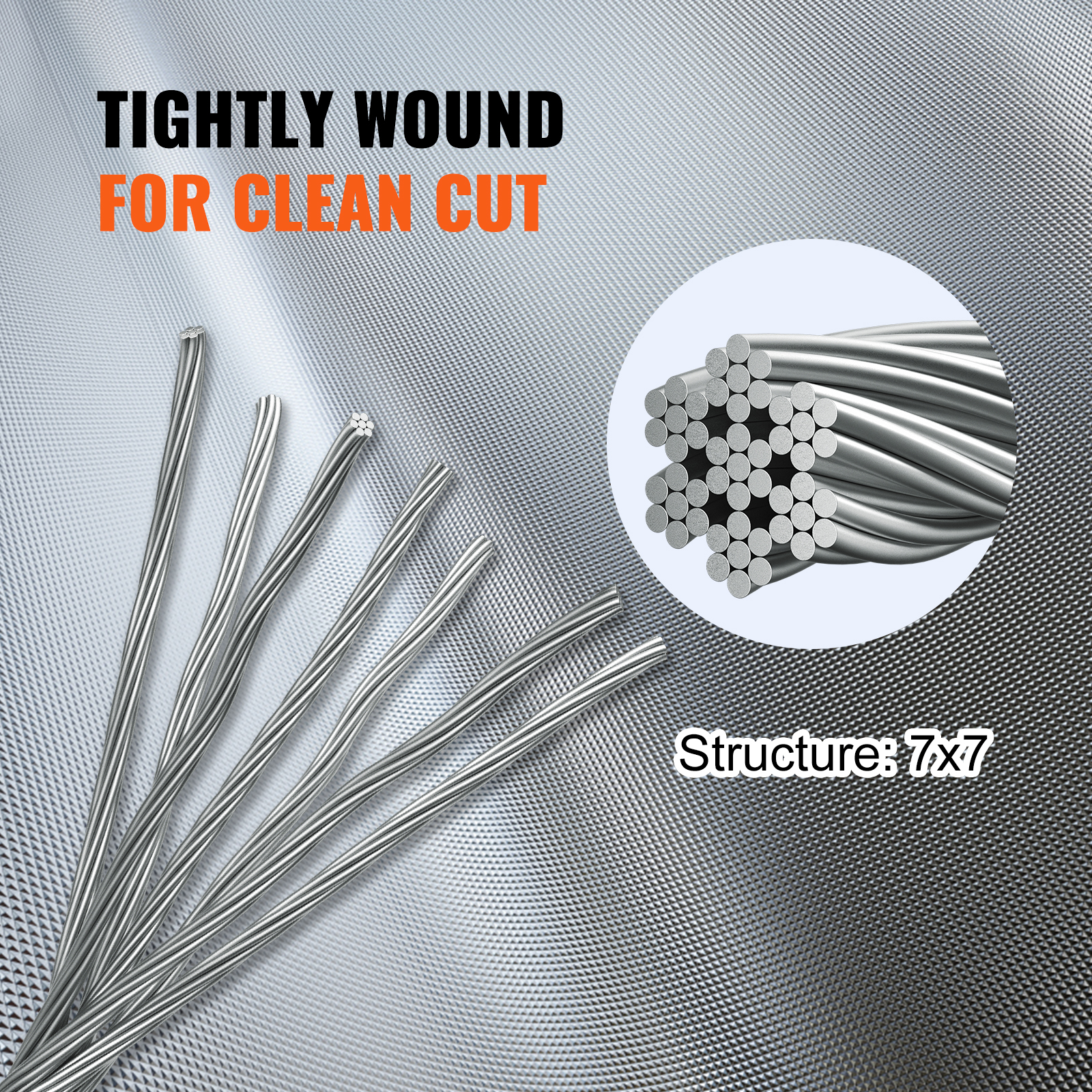 7x7 Strand Core: Our cable's secret is in its strength! This stainless steel cable has a 7x7 structure construction; 7 groups of 7 strands are braided together to form the cable. Thanks to the strong core construction, this wire rope is tightly wound for even cut. Customize the length with a cutter and get your ideal cable with no burrs.