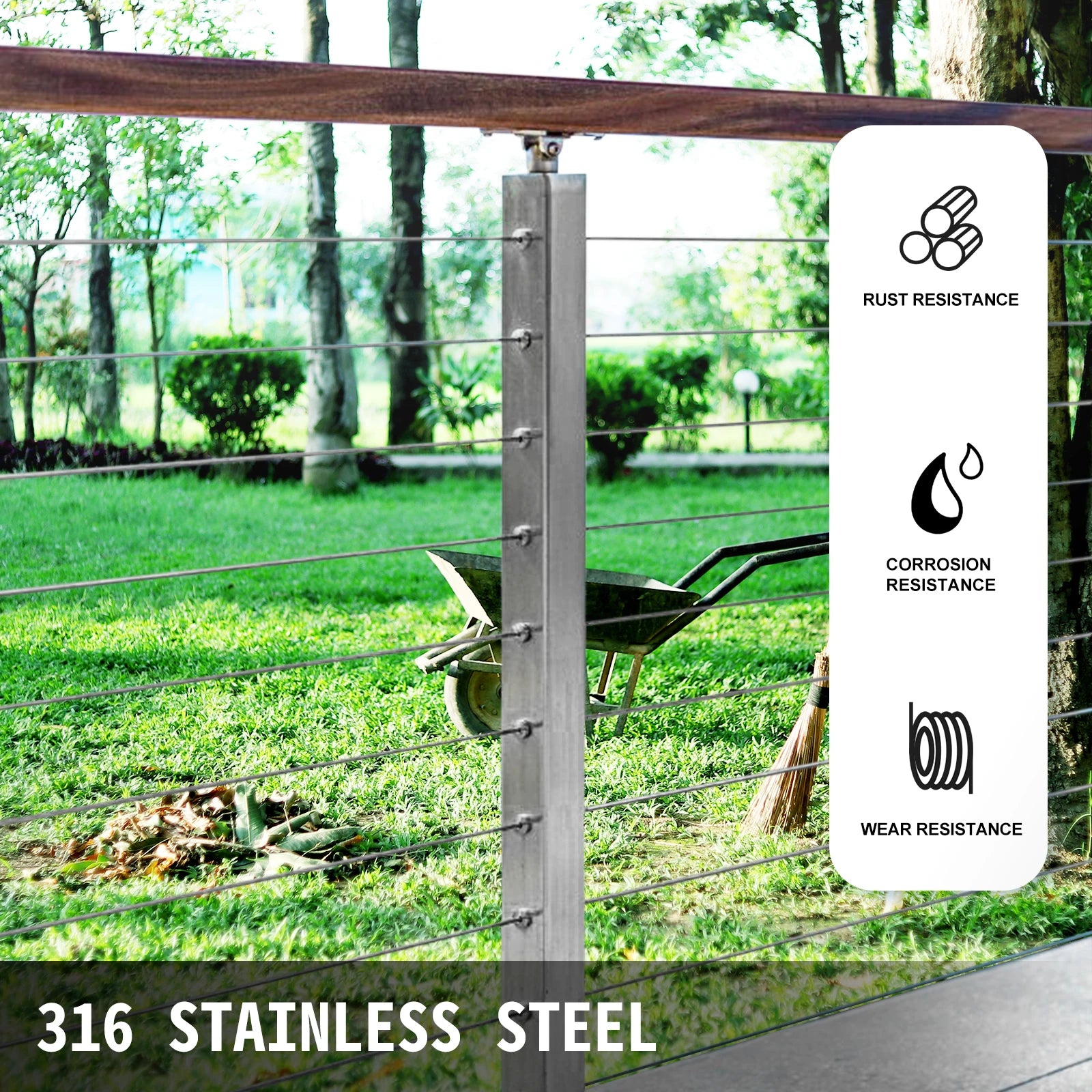 Marine-Grade Material: Take your property seriously and start protecting your space! Our wire rope is made from a high-strength T316 stainless steel material, offering wear-proof and rust-proof features. There is no need to worry about corrosion, ensuring you excellent durability and longevity. Set the stylish and sleek railing system in your yard with this wire cable, and enjoy leisure time surrounded by safety.