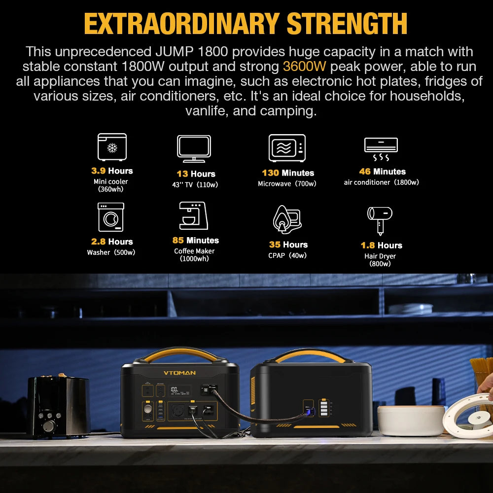 VTOMAN JUMP 2200 / JUMP 1800 Portable Power Station 828/1548Wh LiFeP04 Battery Solar Generator Solar for Home Outdoor Camping